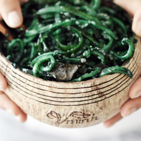 - Spirulina-Pulver zugeben und gut vermengen, bis die Gurkennudeln gleichmäßig grün sind.