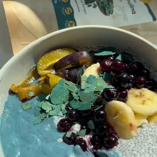 4. Vor dem Servieren mit Pflaumenspalten, Bananenscheiben, Wildheidelbeeren und Spirulina-Streuseln garnieren.