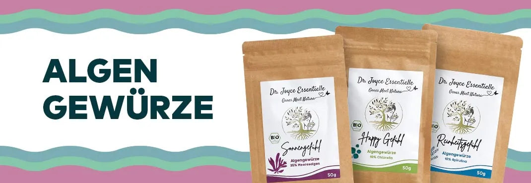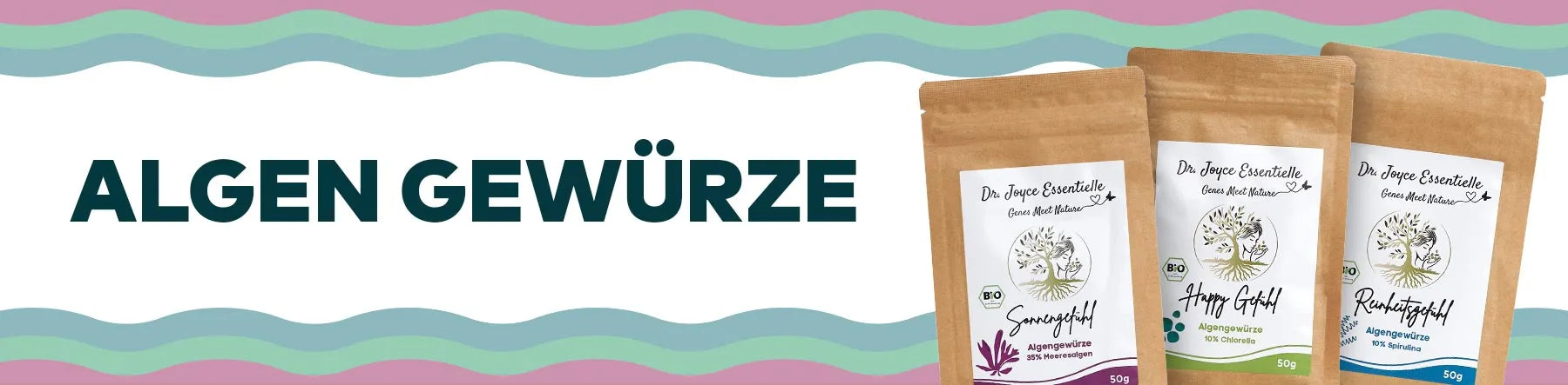 Neben klassischen Flocken und Salz bieten wir auch Mischungen wie Happy Gefühl (Kräuter mit Chlorella), Sonnengefühl (mit Spirulina) und Reinheitsgefühl (orientalische Gewürze mit Spirulina). Diese Kreationen verbinden Algenkraft mit aromatischen Kräutern und sorgen für einzigartige Geschmackserlebnisse.
