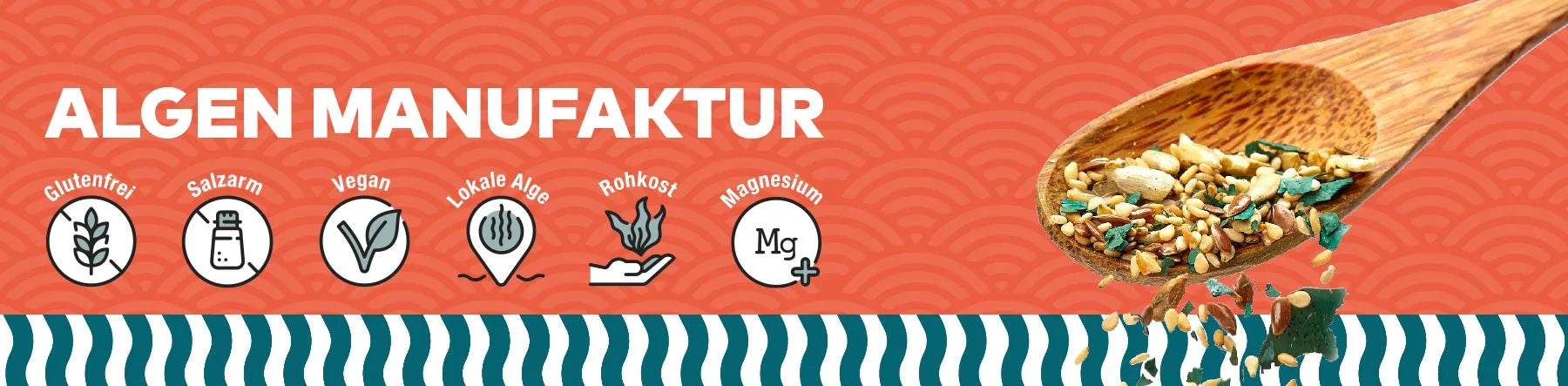 Willkommen bei der Algen Manufaktur – deinem Anlaufpunkt für Algen-Feinkost-Produkte aus kleinen Handwerksbetrieben. Unsere Produkte vereinen gesunden Genuss, Nachhaltigkeit und die Vielfalt der Spirulina-Alge. Von salzfreier Spirulina-Nussmischung über Algen-Brotbackmischung bis hin zu Granola und Rohkost-Schokolade – wir entwickeln ständig neue Ideen für außergewöhnliche Algen-Rezepte.
