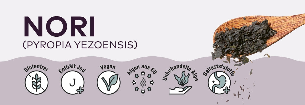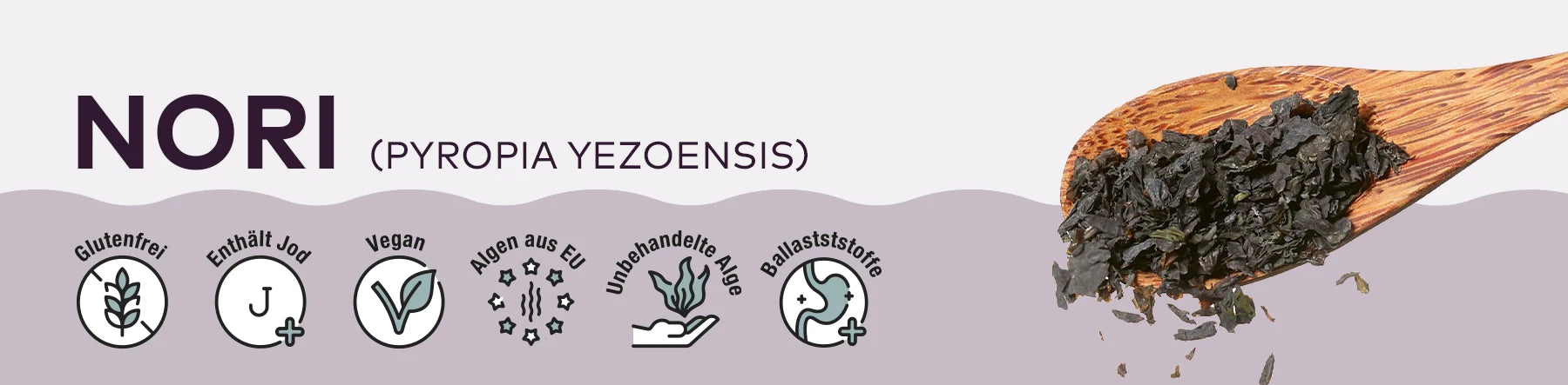 Nori ist reich an Jod, das wichtig für die Schilddrüse und Hormonproduktion ist. Außerdem liefert sie Proteine, Ballaststoffe, Kalzium, Eisen und Vitamine – eine Kombination, die Knochen, Muskeln und Immunsystem unterstützt.