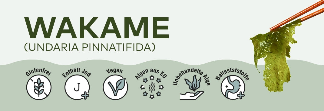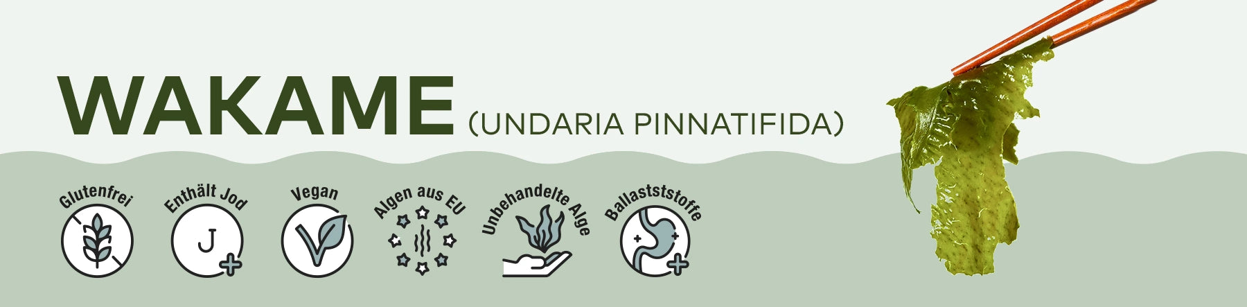 Wakame (Undaria pinnatifida) ist eine Braunalge mit grünbraunen bis goldgelben Blättern. Sie hat ihren Ursprung in Japan und Korea, wird aber heute auch in Europa angebaut. Ihr mild-süßlicher Geschmack macht sie ideal für Suppen, Salate und Algensalat.
