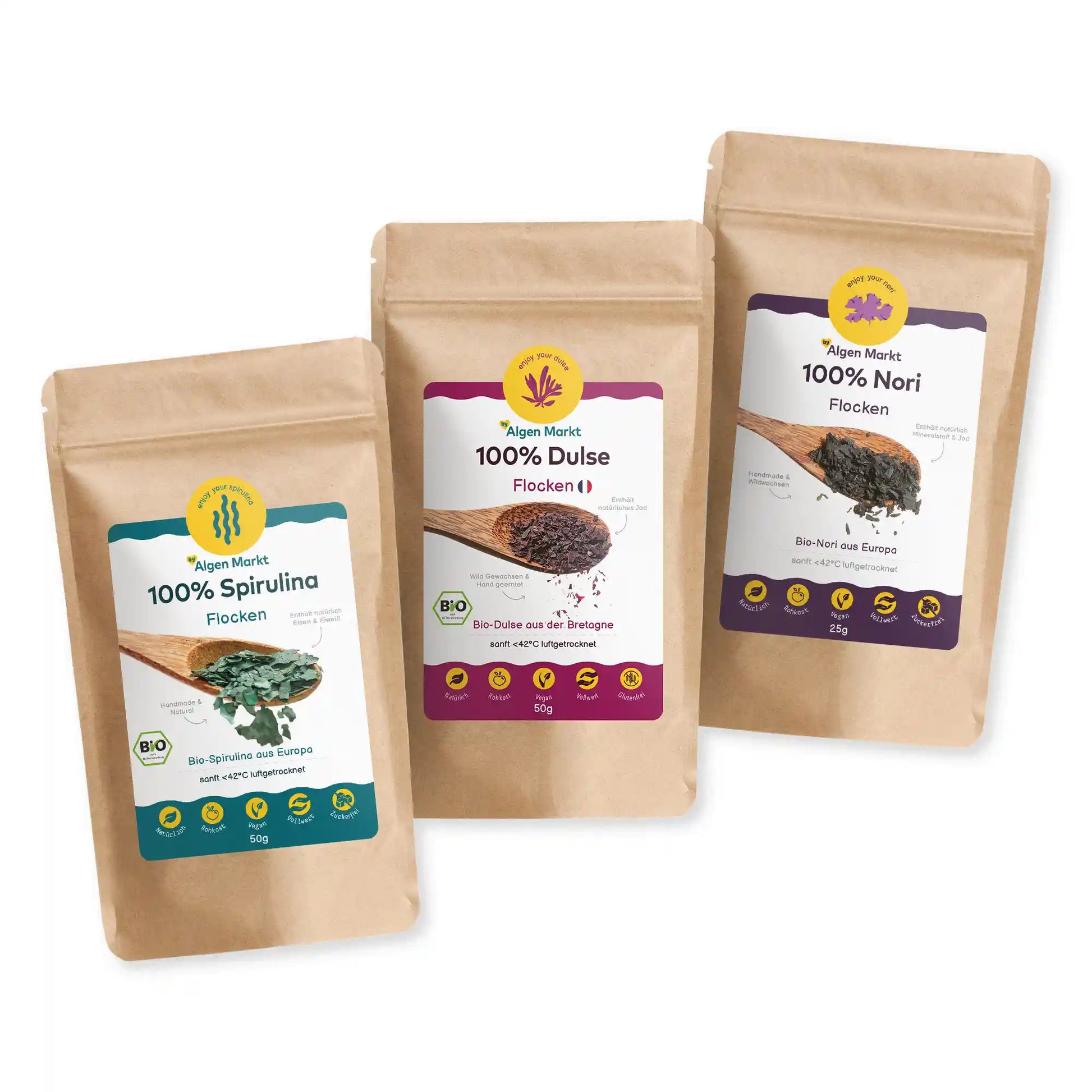 In diesem hochwertigen Set erhältst du drei ausgewählte Algen in Rohkostqualität: